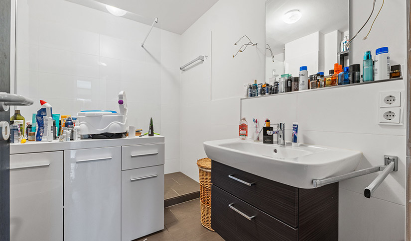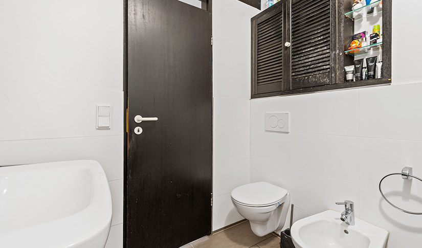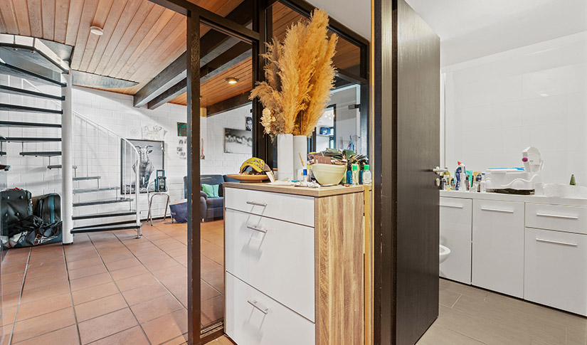Das Badezimmer im Erdgeschoss ist hell gefliest und verfügt über eine Dusche. Im Eingangsbereich der Wohnung befindet sich ein großer Einbauschrank.