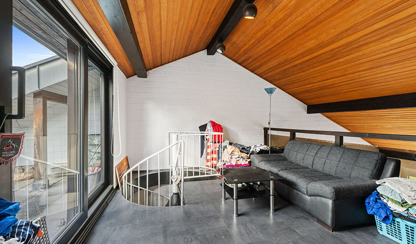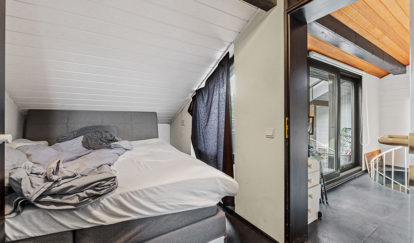Vom Erdgeschoss aus gelangt man über eine Wendeltreppe ins Dachgeschoss. Hier wurde Laminat und Fliesenboden verlegt. Ein Badezimmer mit Dusche ist vorhanden. Das Dachgeschoss wird derzeit als Schlafbereich genutzt. Auf dem beigefügten Grundriss wird es als Abstellfläche gekennzeichnet, während des Baus wurde dies jedoch zu einem Bad und Gästezimmer umgewandelt.
